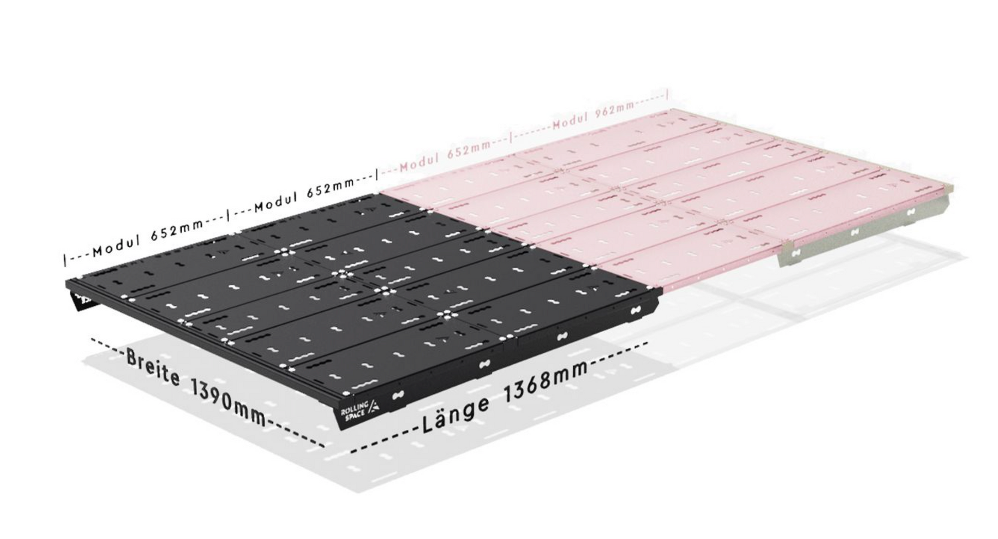 Es gibt verschiedene Ausbaustufen dieses Dachträgers, welche auf zwei Längs- (in Fahrtrichtung) und 4-5 Querträgern basieren. Die Querträger werden mit hochwertigen Nutensteinen bestückt. Diese können individuell verschoben werden, sodass man immer einen Befestigungspunkt findet. Auch die begehbaren Erweiterungsmodule mit dem Airlinemuster, welche das System so einzigartig und genial machen, werden auf diesen Grundträgern befestigt.