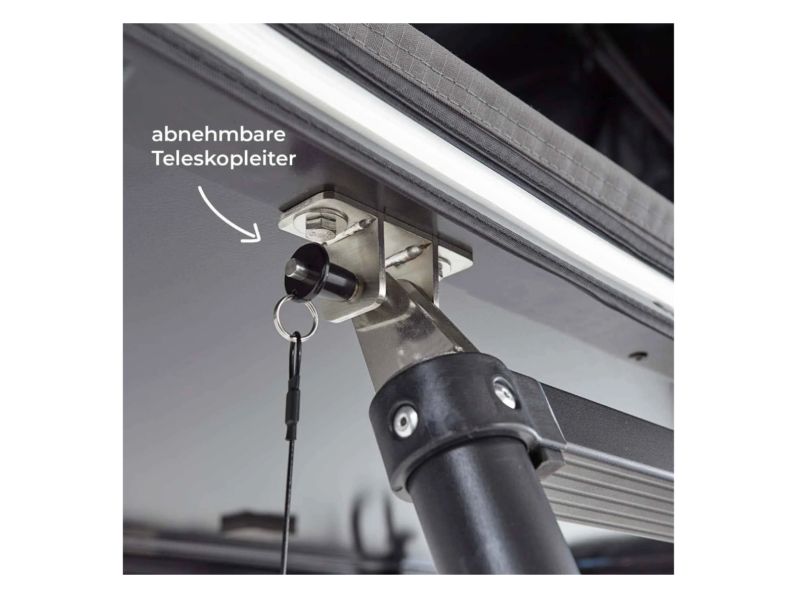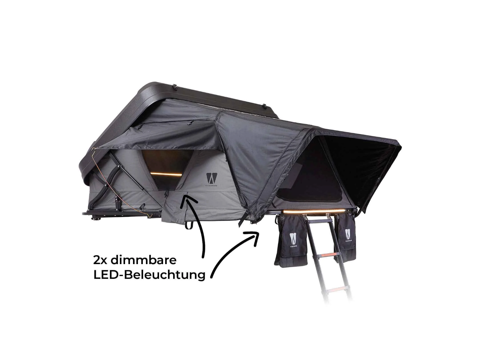 Klappzelt und Hartschale in einem vereint, das ist das VICKYWOOD MIGHTY OAK 190 GENERATION. 3.0! Durch sein schickes Design setzt es nahezu jedem Fahrzeug ein Krönchen auf. Der superleichte Aufbau wird durch die STABILUS-Gasdruckfedern an der Seite unterstützt, einfach die 4 Schnallen an der Unterseite lösen und der Korpus fährt von selbst nach oben, anschließend nur noch das Vorderteil ausklappen und schon hast du eine Liegefläche von knapp zwei Metern Länge!