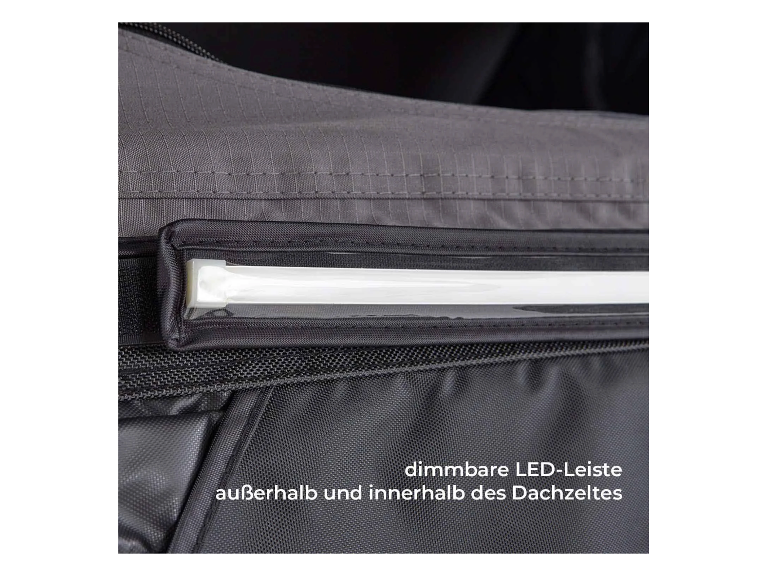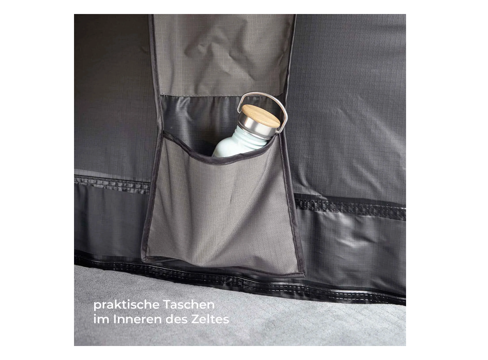 Sobald du dein MIGHTY OAK aufgebaut hast, kannst du über die individuell einstellbare Aluminium-Teleskopleiter hineinklettern. Deine Schuhe verstaust du am besten in den beiden Schuhtaschen am Zelteingang. Oben angekommen erwartet dich ein tolles Raumgefühl. Du hast nicht nur zu deiner Rechten und Linken ein Fenster, sondern kannst auch auf der Kopfseite deinen Blick über die Landschaft schweifen lassen! Alle Fenster sind natürlich mit einem engmaschigen Moskitonetz versehen, damit du auch ohne Insektengetier lüften kannst. Sehr komfortabel und um umständliches Handtieren mit Taschenlampen, etc. zu vermeiden ist die dimmbare LED Innenbeleuchtung, die du ganz einfach über einen USB-Anschluss an einer Powerbank zum Leuchten bringst. Wenn du dich in die Waagrechte begibst, wirst du feststellen, dass dir die Memory Foam Matratze optimalen Liegekomfort bietet und du mindestens genauso gut schlafen wirst wie in deinem Bett zu Hause.